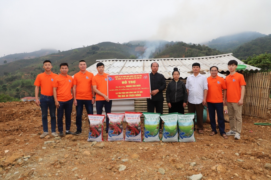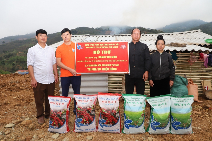 Nhằm hỗ trợ gia đình ông Hoàng Văn Miển có hoàn cảnh khó khăn, đồng thời chia sẻ, động viên những mất mát do thiên tai, hoả hoạn gây ra. Ngày 09/4/2024, Công ty cổ phần phân bón Sông Lam Tây Bắc, Công ty CP chế biến cà phê Sơn La phối hợp với UBND xã Chiềng Dong, huyện Mai Sơn đến hỗ trợ 3,3 tấn phân bón NPK cho cây cà phê, trị giá 30 triệu đồng cho hộ ông Hoàng Văn Miển, giúp gia đình có điều kiện để phát triển sản xuất, sớm ổn định cuộc sống.