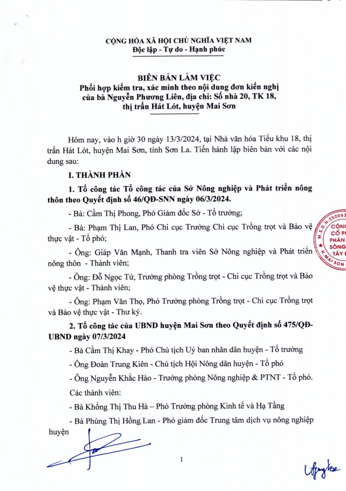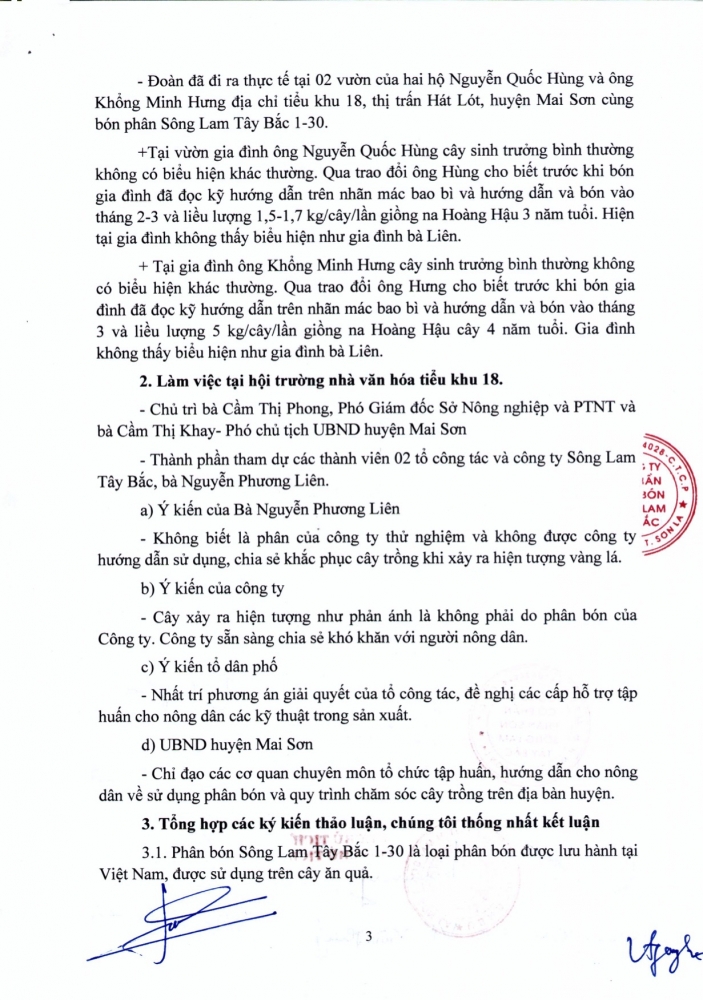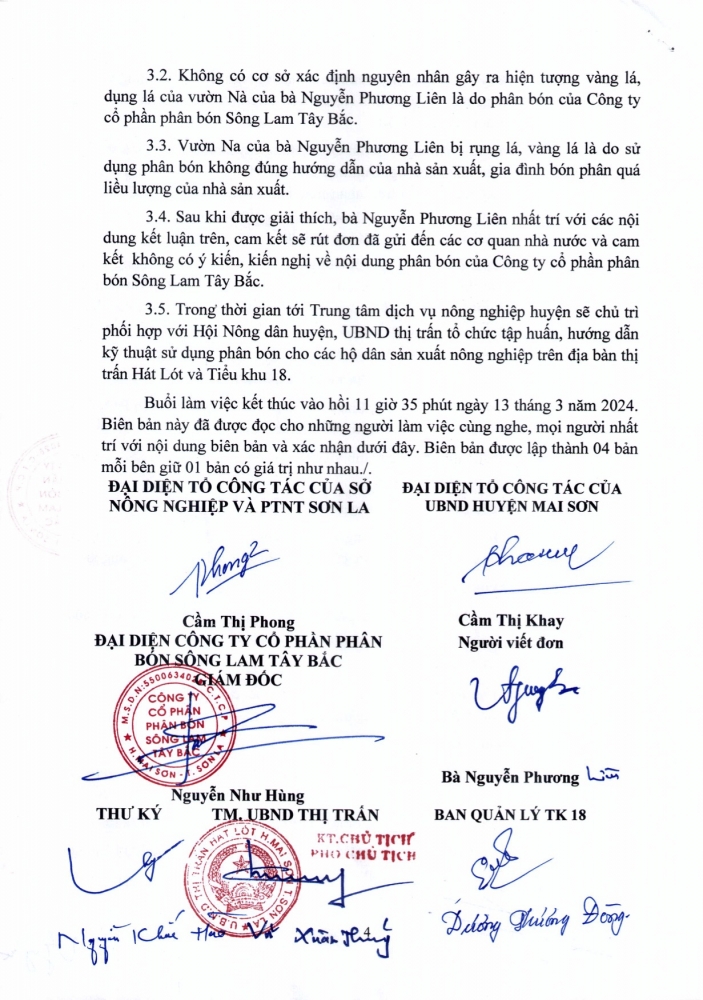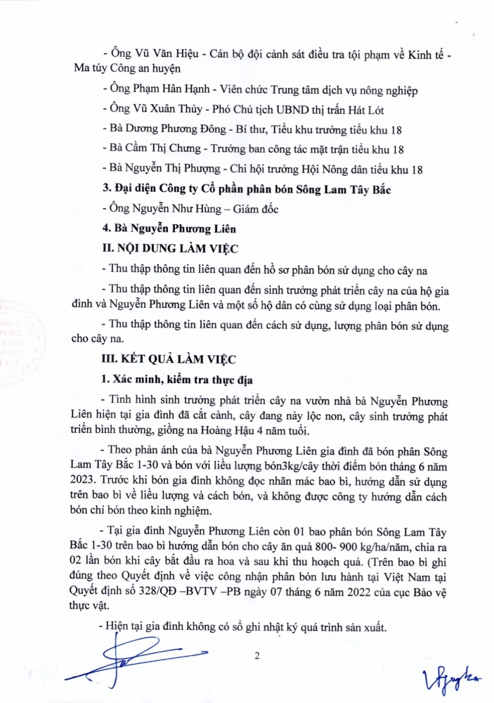 Thời gian qua, trên mạng xã hội facebook có đăng thông tin, hình ảnh người dân sử dụng sản phẩm phân bón Sông Lam Tây Bắc bị ảnh hưởng đến vườn Na tại TK 18, thị trấn Hát Lót, huyện Mai Sơn, tỉnh Sơn La. Sau khi kiểm tra, đánh giá và được UBND tỉnh Sơn La chỉ đạo cơ quan quản lý nhà nước (gồm Sở Nông nghiệp và PTNT, UBND huyện Mai Sơn, UBND Thị trấn Hát Lót, BQL TK 18 - TT Hát Lót) vào làm việc. Tổ công tác đã xác nhận nguyên nhân vườn Na tại TK 18, thị trấn Hát Lót, huyện Mai Sơn, tỉnh Sơn La bị vàng lá không phải do sử dụng phân bón Sông Lam Tây Bắc (có biên bản làm việc kèm theo).