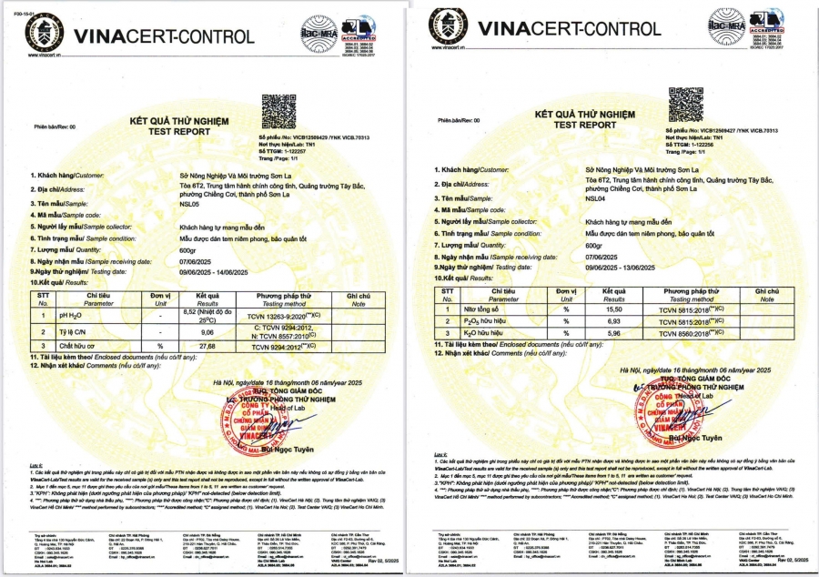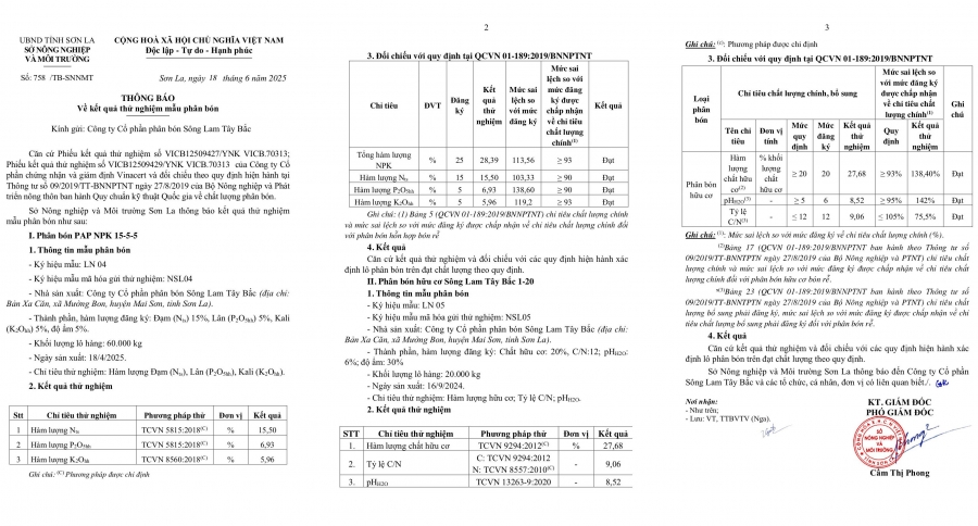 Kết quả kiểm nghiệm cho thấy tất cả các mẫu phân bón đều đạt các chỉ tiêu về hàm lượng dinh dưỡng và chất lượng, tuân thủ nghiêm ngặt các quy định hiện hành. Kết quả này không chỉ khẳng định uy tín của Công ty Sông Lam Tây Bắc mà còn là minh chứng cho hiệu quả của công tác quản lý, giám sát trong lĩnh vực sản xuất và kinh doanh phân bón tại Sơn La.