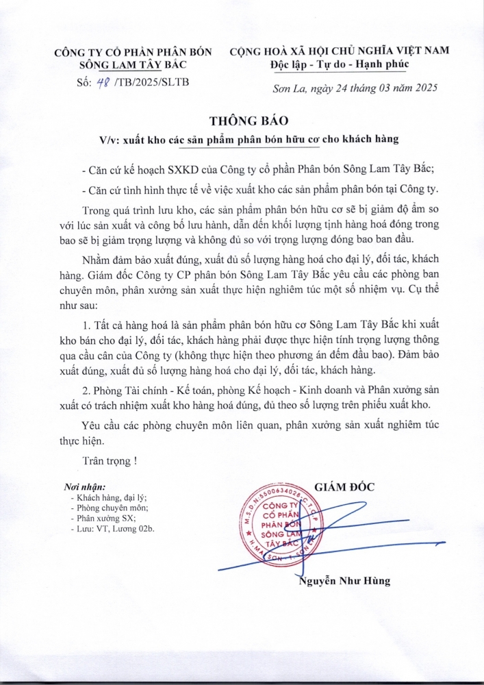 Thông báo số 48/TB/2025/SLTB ngày 24/03/2025 về việc đảm bảo số lượng, chất lượng hàng hoá cho khách hàng trong quá trình xuất kho tại nhà máy phân bón Sông Lam Tây Bắc